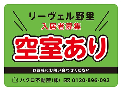 この空室あり看板は、黄色と黒の対比が目を引く、インパクトのあるデザインです。空室があることをわかりやすく伝え、物件への興味を引くという目的をしっかりと果たしています。物件名を入れることでお問い合わせの際もスムーズにご案内できます。社名、電話番号はもちろん内容も自由に変えられます。
