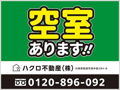 「空室あり!!」の文字が大きく、太字で書かれており、視認性が高いです。感嘆符が2つ付いていることで、よりアピール感が強くなっています。「空室あり」という情報がシンプルに伝わるように、余計な情報が省かれています。社名、電話番号はもちろん内容も自由に変えられます。