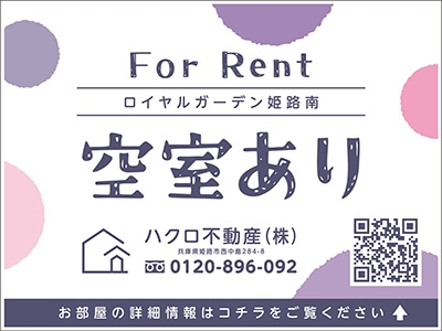 パステルカラーの円形が配置されていることで、全体的に柔らかく親しみやすい印象を与えています。特に女性やファミリー層をターゲットとする場合、このようなデザインは効果的です。右下にQRコードを配置することで、スマートフォンユーザーが手軽に物件情報にアクセスできるようになっています。ウェブサイトへの誘導文と合わせて、オンラインへの誘導を強化しています。社名、電話番号はもちろん内容も自由に変えられます。