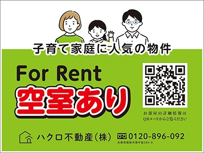 「子育て家庭に人気の物件」というキャッチコピーと家族のイラストによって、ターゲット層が明確に示されています。これは、看板を見る人に「これは自分たちのための情報だ」と思わせる効果があり、興味を引きつけやすくなります。温かみのあるイラストは、親しみやすさを演出し、物件への好印象を与えやすくなります。社名、電話番号はもちろん内容も自由に変えられます。