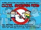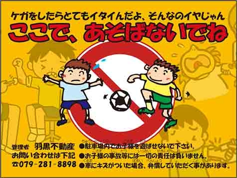 子どもの事故やトラブルを防ぐための駐車場看板です。「ケガをすると痛い」という情報を、文字とイラストでわかりやすく伝えています。まだ漢字が読めない低学年の児童向けに、平仮名とカタカナを使ってわかりやすい文章を記載。前面に黄色を採用することで、子どもの目にも目立ちやすくしています。