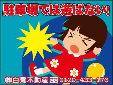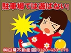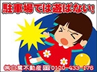 ボール遊びをしている女の子が、転倒する姿をデザインした駐車場看板です。「車と衝突すると危険だから、駐車場内で遊んではいけません」というメッセージを、わかりやすく伝えています。看板上部には、はっきりとした文字で情報を表示。子ども本人だけではなく、周囲の大人に対するアピール力も高めています。