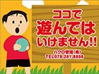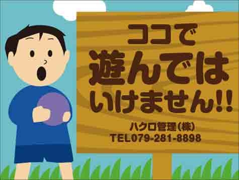 この注意看板は、草むらでボール遊びをしようとしている男の子のイラストが入っています。また、木製の立て看板にはあそんではいけませんという警告表示がなされています。イラスト入りで子供にもわかりやすいデザインです。社名、電話番号はもちろん内容も自由に変えられます。
